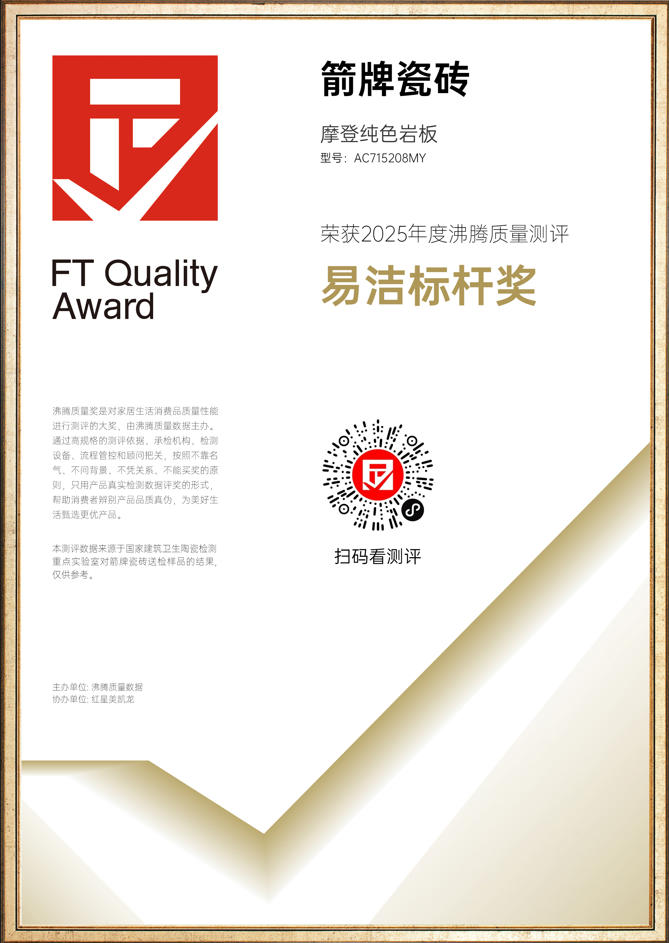 箭牌瓷砖参评的摩登纯色系列经过承检机构国家建筑卫生陶瓷检测重点实验室,对产品的基础指标、易洁性能、安全性能中的11项指标进行严格检测,结果达到测评标准要求,并且多项性能指标优于标准要求,荣获“易洁标杆奖”、“安全标杆奖”!