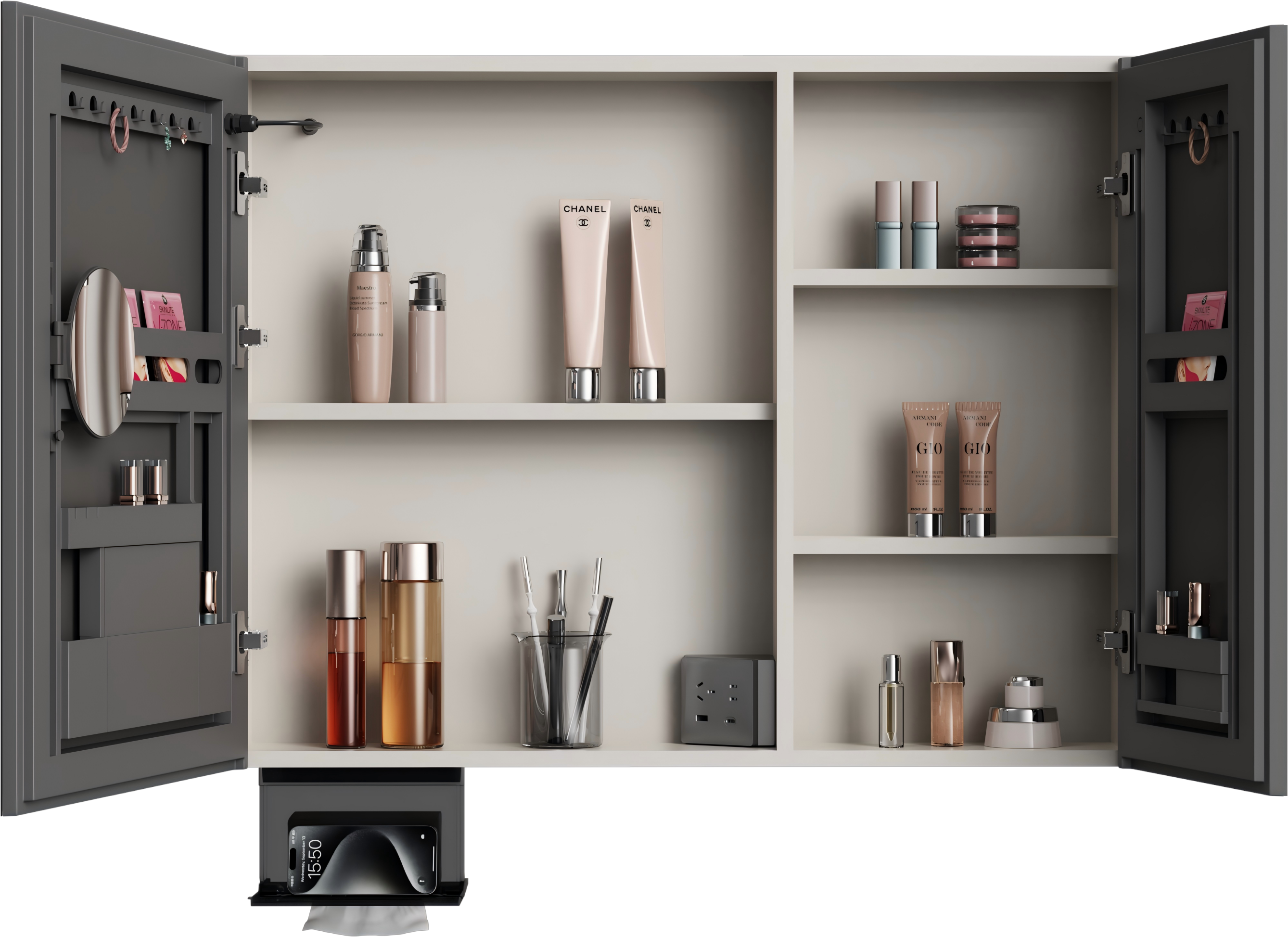 镜门后精心设计的多功能收纳空间,内部分区合理,大小各异的隔层,满足了各种物品的收纳需求。翻转式纸巾架,抽纸孔取纸,抽取更便捷,同时还能放置临时物品,如手机和眼镜等,便于洗漱时的各种放置需求。
